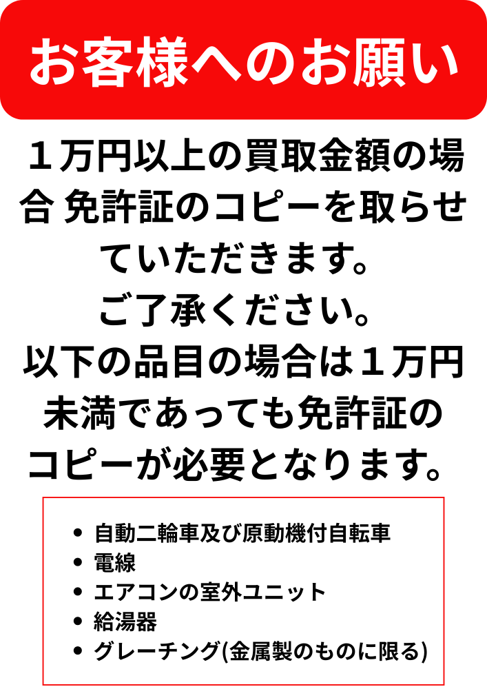 スクラップ法の改正により左記の品目の買取の場合は1万円以下であっても免許証のコピーをお願いしております。ご了承お願いいたします。